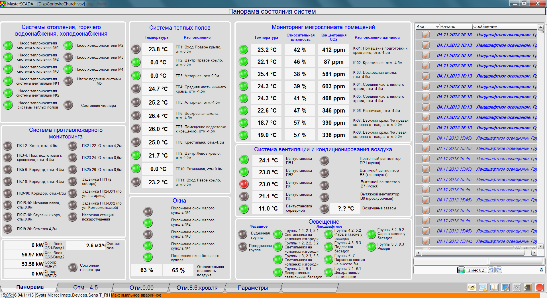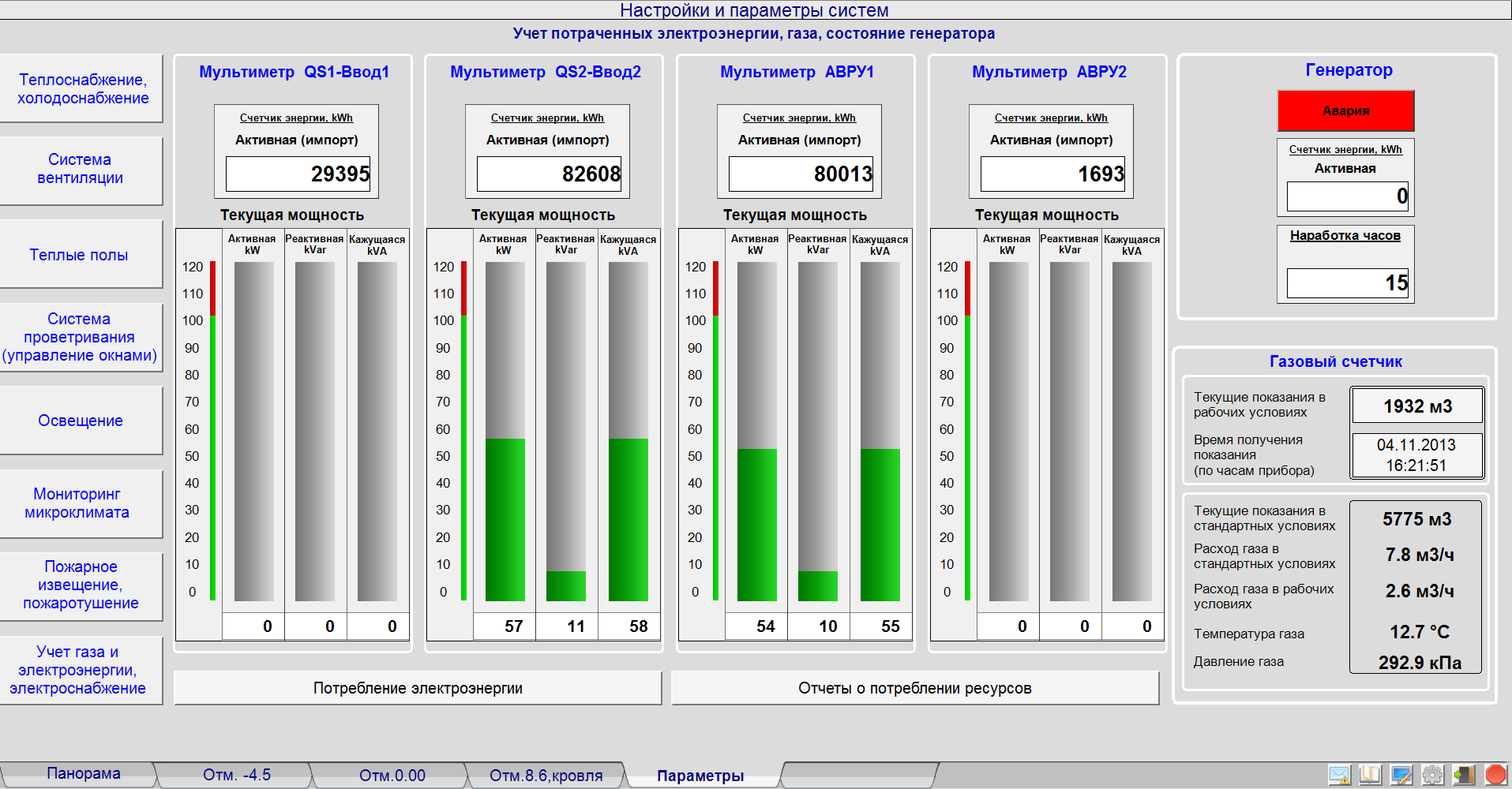 Система диспетчерського управління моніторить стан пристроїв електропостачання (електричні вводи на територію та в будівлю, резервний генератор), а також споживання енергоресурсів: електроенергії та природного газу.