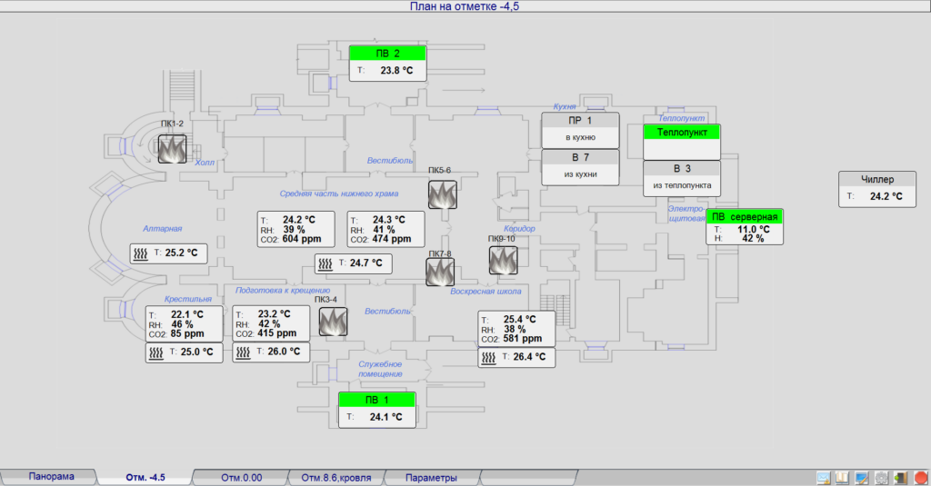 - надання інформації про стан підконтрольних інженерних систем персоналу та посадовим особам у вигляді мнемосхем, графіків зміни технологічних параметрів, архівів стану обладнання, звітів;