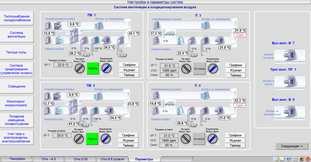 Переходи сторінками технологічних параметрів установок за допомогою панелі швидкого переміщення використовуються для швидкого доступу до інформації про стан та керування конкретною установкою життєзабезпечення. У лівій частині екрану розташований вертикальний ряд кнопок-переходів між окремими технологічними системами.