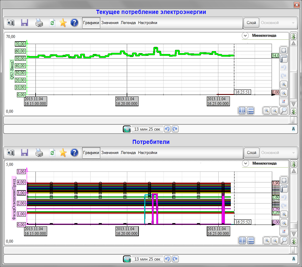 Для зручності аналізу споживання електроенергії існує зведений графік споживання та увімкнених споживачів. Переглядаючи залежності між поточним споживанням електроенергії та увімкненими на даний момент установками, можна підвищити рівень енергоменеджменту об’єкта, оптимізувавши роботу компонентів та затрати.